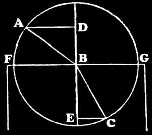 Die hauptsächlichste Eigenschaft der Lichtbrechung besteht darin, dass ein Lichtstrahl, wie AB, der durch die Luft geht und schräg auf die glatte Fläche eines durchsichtigen Körpers wie FG fällt, im Einfallspunkte B so gebrochen wird, dass er mit der Geraden DBE, welche die Fläche senkrecht schneidet, einen Winkel CBE bildet, der kleiner ist als der Winkel ABD, den er mit derselben Senkrechten in der Luft bildete. Das Maass dieser Winkel findet man. wenn man um den Punkt B einen Kreis beschreibt, welcher die Strahlen AB und BC schneidet. Denn die von den Schnittpunkten auf die Gerade DE gefällten Senkrechten AD, CE, welche man die Sinus der Winkel ABD, CBE nennt, stehen unter sich in einem bestimmten Verhältniss, das bei allen Neigungswinkeln des einfallenden Strahles für ein und denselben Körper stets das nämliche ist. Beim Glase ist dies Verhältniss sehr nahe wie 3 zu 2 nnd beim Wasser nahezu wie 4 zu 3, und in ähnlicher Weise verschieden bei anderen durchsichtigen Körpern.