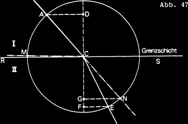 An der Grenzschicht RS ändert sich die Geschwindigkeit (oder, wie NEWTON sagt, die Bewegung) des Strahls. Im Medium I stellen die Längen der Radien MC und AC des Einheitskreises der Abb. 47 zugleich die Größe der Lichtgeschwindigkeit dar. Im Medium II müssen die Radienlängen CE und CN jedoch noch mit einem gewissen "Maßstabsfaktor" m multipliziert werden, um wieder die (geänderte) Lichtgeschwindigkeit zu ergeben. Dieser Faktor ergibt sich aus den parallel zu RS gerichteten Geschwindigkeitskomponenten. Bei streifendem Einfall gilt: