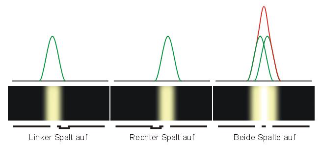 Zunächst wird betrachtet, welches Schirmbild sich jeweils mit nur einem offenen Spalt ergibt. Man sieht jeweils einen einzelnen Streifen. Öffnet man nun beide Spalte, müssten sich die Lichtintensitäten auf dem Schirm addieren, da ihn ja nun doppelt so viele Lichtteilchen treffen.