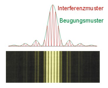 Das Interferenzmuster der beiden Spalte wird durch ein Beugungsmuster der