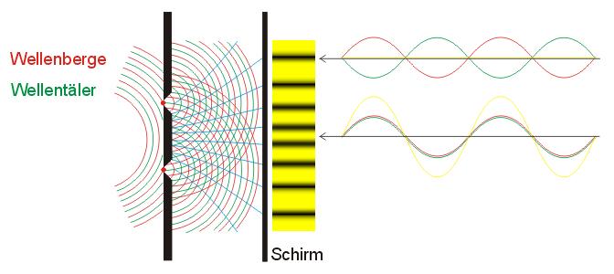 Auch hier gilt: zwei Wellenberge oder zwei Wellentäler verstärken sich. Treffen Wellenberg und Wellental aufeinander, löschen sie sich gegenseitig aus. Das heisst, an diesen Stellen herrscht Dunkelheit.