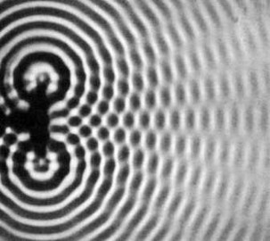 Um die Überlagerung des Lichtes mit der Wellenvorstellung des Lichtes zu erklären, schauen wir uns zunächst das Überlagerungsmuster von Wasserwellen an, das durch das periodische Eintauchen zweier Stifte in einer Wasserwanne erzeugt wird.