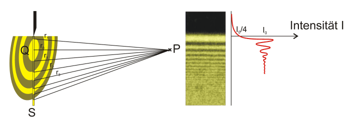 Wir wollen die Wellenbewegung berechnen, die wir in einem Punkt P erwarten. Wir kennen die Wellenbewegung an einer Wellenfront S. Diese können wir in Ringe (im Querschnitt Streifen) einteilen, die symmetrisch zum Punkt Q sind und deren Überlagerung die Wellenbewegung in P hervorruft. Der Abstand r0 von der Ebene S sei viel größer als die Wellenlänge λ. Dann können wir die Ringe so wählen, dass sich ihre aufeinanderfolgenden Abstände von P um λ/2 unterscheiden. Man nennt diese Ringe Fresnelsche Zonen. Die Wellen aufeinanderfolgender Zonen interferieren unter Auslöschung, da ihr Phasenunterschied π ist.