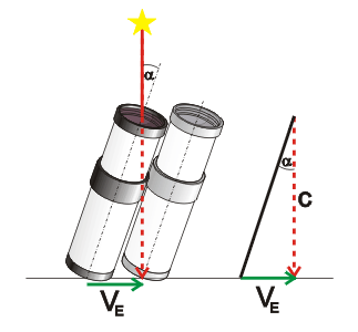 Fernrohr, mit dem der Stern beobachtet wird. Da sich die Erde bewegt (sowohl
