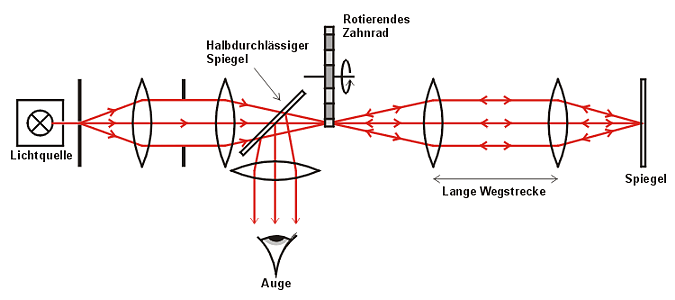 Als erster löste Hippolyte Fizeau 1849 das Problem der Kurzzeitmessung. Er ließ das Licht durch ein rotierendes Zahnrad laufen, nach einer großen Wegstrecke (8,633 km) reflektieren und noch einmal durch das Zahnrad laufen (Lichtquelle und Zahnrad plazierte er übrigens auf einen Hügel vor seinem Haus in Paris und den Spiegel auf den Montmatre).