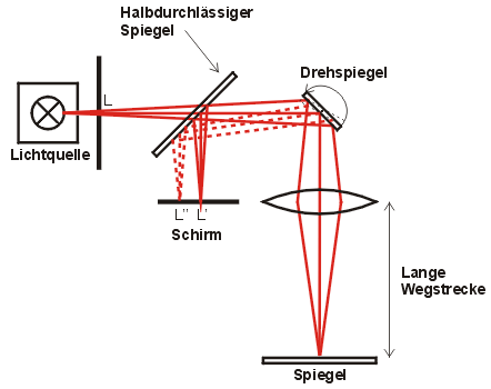 Das Licht durchläuft den Weg s = 2 * Abstand zwischen Drehspiegel und
