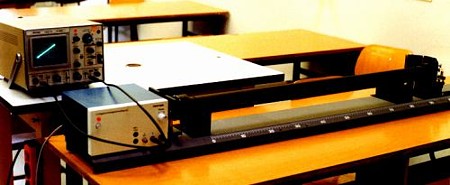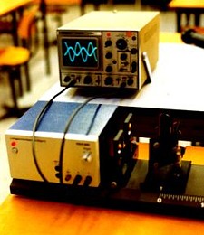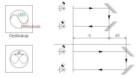 Als Lichtquelle dient eine Leuchtdiode. Sie wird mit Wechselstrom der Frequenz 50,1 MHz betrieben. Deshalb sendet sie Licht mit schnell aufeinander folgenden Helligkeitsschwankungen aus. Nach dem Durchlaufen eines bestimmten Lichtweges wird in einer Photodiode eine Wechselspannung hervorgerufen. Die beiden Wechselspannungen werden mit dem Oszilloskop verglichen.