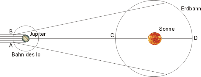 1676 gelang Ole Christensen Römer der erste Beweis der Endlichkeit der Lichtgeschwindigkeit. Er war seit 1672 Mitarbeiter des Astronomen Giovanni Domenico Cassini. Dieser entdeckte 1675 eine gewisse Unregelmäßigkeit in der Bewegung des innersten Jupitermondes (Io), Die Umlaufzeit war davon abhängig, ob sich die Erde vom Jupiter entfernte oder näherte.