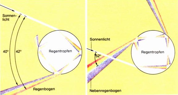 Der Hauptregenbogen entsteht durch Licht, das am oberen Rand auf den Wassertropfen