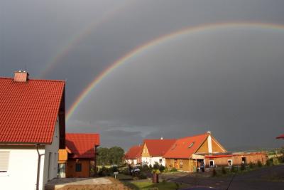 Manchmal beobachtet man nicht nur einen Hauptregenbogen, sondern auch einen lichtschwächeren Nebenregenbogen, bei dem die Farben in umgekehrter Reihenfolge verlaufen.